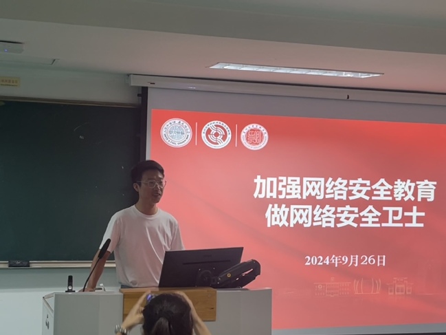 随后,本科生辅导员李磊以“加强网络安全教育,做网络安全卫士”为主题,就网络信息隐患与如何提高网络安全意识与学员们进行网络安全理论知识的宣传普及。他向学员们讲解了政治安全的含义,并以案说法、直观易懂地对相关案例进行深度剖析,强调每位同学要注意区分网络信息真伪,保护个人隐私并及时举报可疑行为。
