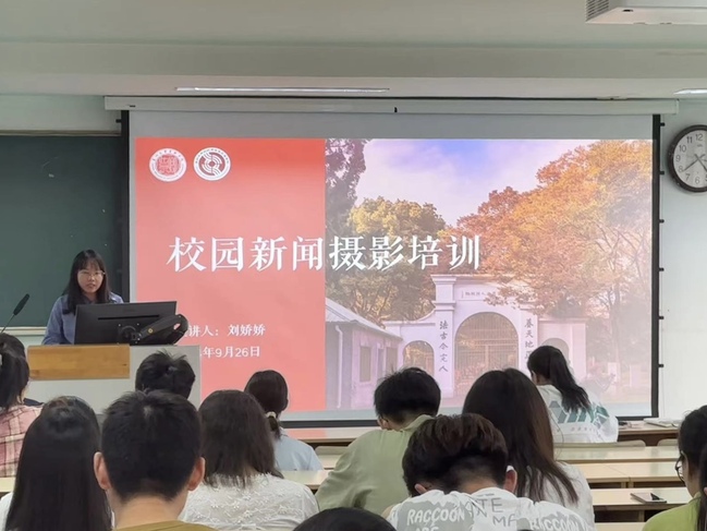 新媒体中心指导老师刘娇娇以“校园新闻摄影培训”为主题进行专题讲座,主要围绕相机参数、功能等基础知识、活动拍摄技巧以及后期图片与数据处理等方面讲解了新闻摄影的基本原则与关键技术点,并结合具体案例,从活动现场、领导讲话、主要人物讲话、大全景等多个不同场景,为学员们详细解析了正确的拍摄思路手法。学员们表示通过培训不仅懂得了如何运用摄影技巧来捕捉校园的美好瞬间,还学会了如何从新闻价值的角度去思考和构图。