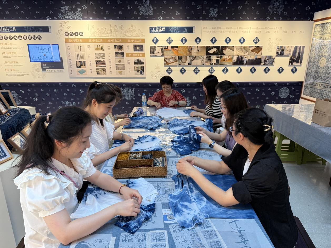 在专业老师的指导下,党员们还体验了缂丝、扎染等传统手工艺。大家亲手操作织布机,穿梭的梭子、交织的经纬,在实践中感受缂丝制作技艺的精妙。图案设计定位、折叠、捆扎、点缀、夹……在扎染体验环节,党员们通过各种形式的组合,设计扎染T恤衫。看似无序的捆扎,带来的却是创作的惊喜。