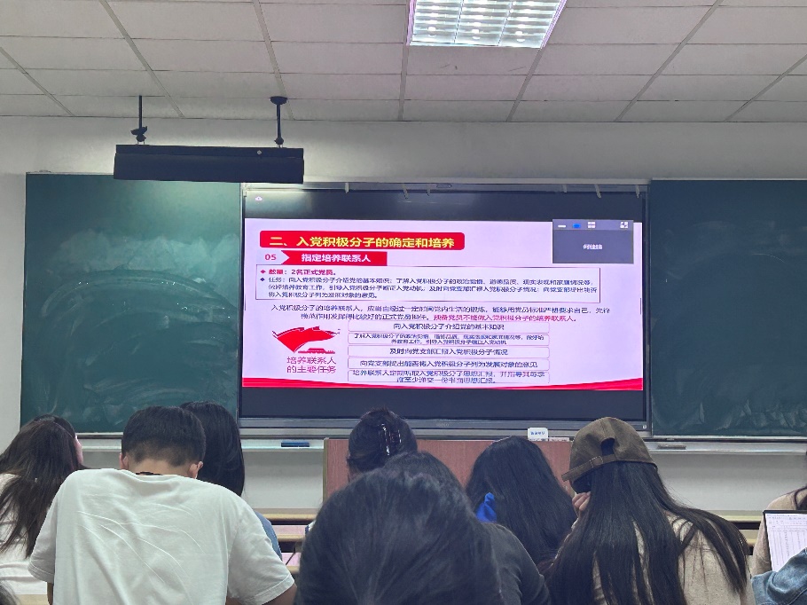 本次活动特别邀请了研究生三支部的支部书记何佳臻老师,她为大家详细介绍了入党流程及相关注意事项。何老师从入党条件、入党申请书的写作要求以及入党流程中关键节点等方面进行了全面讲解,帮助同学们更好地理解入党的基本要求和程序。除此之外,何老师还分享了如何在日常生活和学习中积极向党组织靠拢、如何树立正确的政治理念,并强调了入党不仅是一个政治身份的认可,更是个人思想觉悟和社会责任感的提升。她鼓励大家要有坚定的信念和责任感,积极投入到党组织的学习和实践中,争取早日成为一名合格的共产党员。