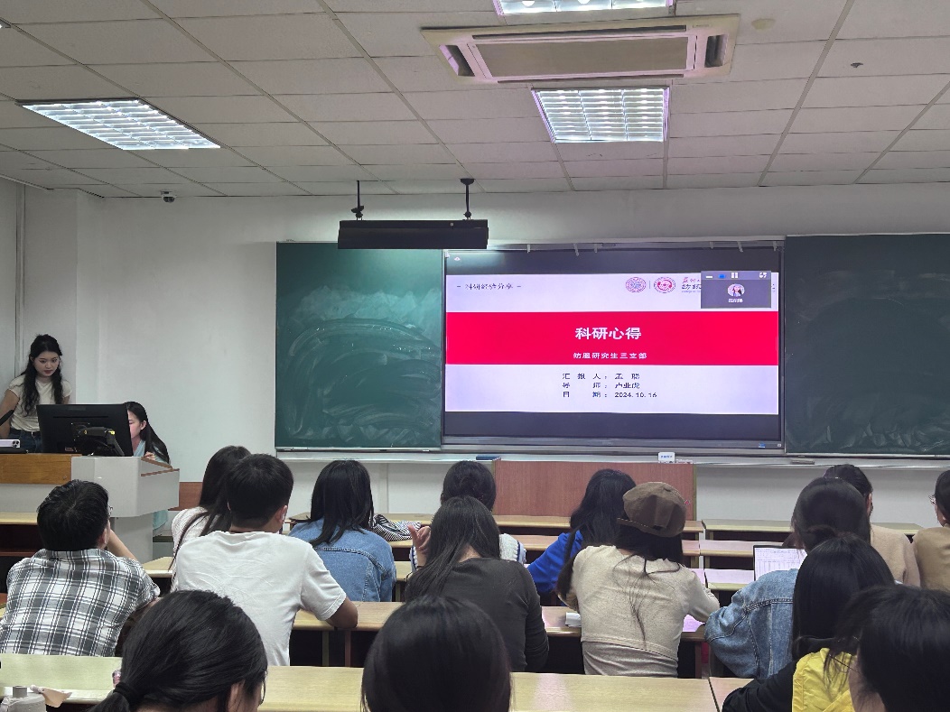 研究生一支部的优秀党员代表季如意同学为大家带来了关于如何在科研过程中平衡心态、保持身心健康的经验分享。季如意同学是2024年国家奖学金获得者,她从自己的科研经历出发,谈到在高强度的科研工作中,压力常常会无形中积累,尤其是面对繁重的实验任务,如何保持良好的心态至关重要。