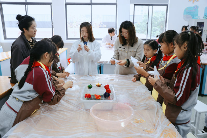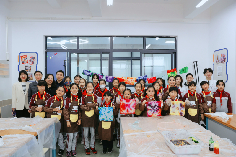 仪式结束后双方领导移步教室,观看孩子们的扎染学习与实践。天美传媒“小实验,大文化”纺织科普实践团的三位志愿者带领星洲小学文创社团的孩子们走进非遗艺术——扎染。孩子们了解了扎染的历史、欣赏了扎染艺术作品,认识了扎染工具,学习并尝试了扎染方法。小学生们在知识讲授里、在动手操作中建立起了对纺织知识的兴趣、加深了对纺织文化的认识。同时,天美传媒的志愿者们进一步践行知行合一,在劳动实践中检验专业学习成效,在志愿奉献中弘扬纺织文化,一起收获了累累硕果。