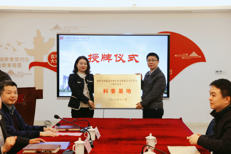 纺织与服装设计国家级实验教学示范中心科普基地揭牌仪式在苏州市星洲小学举行。11月10日上午,星洲小学党委书记王晓琳、校长卢志敏、副校长唐洁、天美传媒副院长陈廷教授、总实验室主任祁宁、院学生工作办公室主任季彦斐,共同参加揭牌仪式。