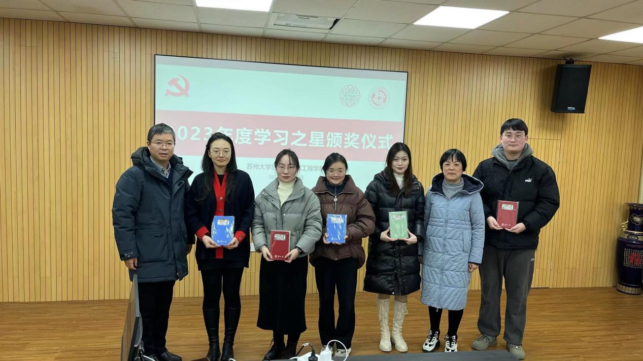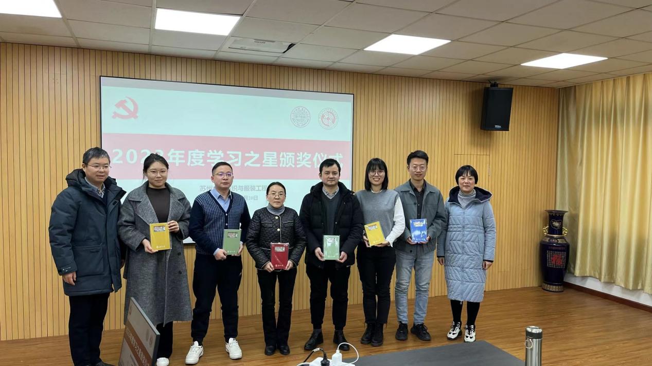 述职大会结束后,进行2023年度学习强国学习之星颁奖仪式,肖甫青和虞岚为各支部本年度学习强国积分前2名的党员颁发奖品。