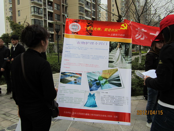 研究生轻化工程第一支部在4月15日,本着发挥纺织专业优势,服务大众的原则,走进苏州工业园区翰林缘社区,组织开展了以“党员服务进社区”为主题的党日活动。
