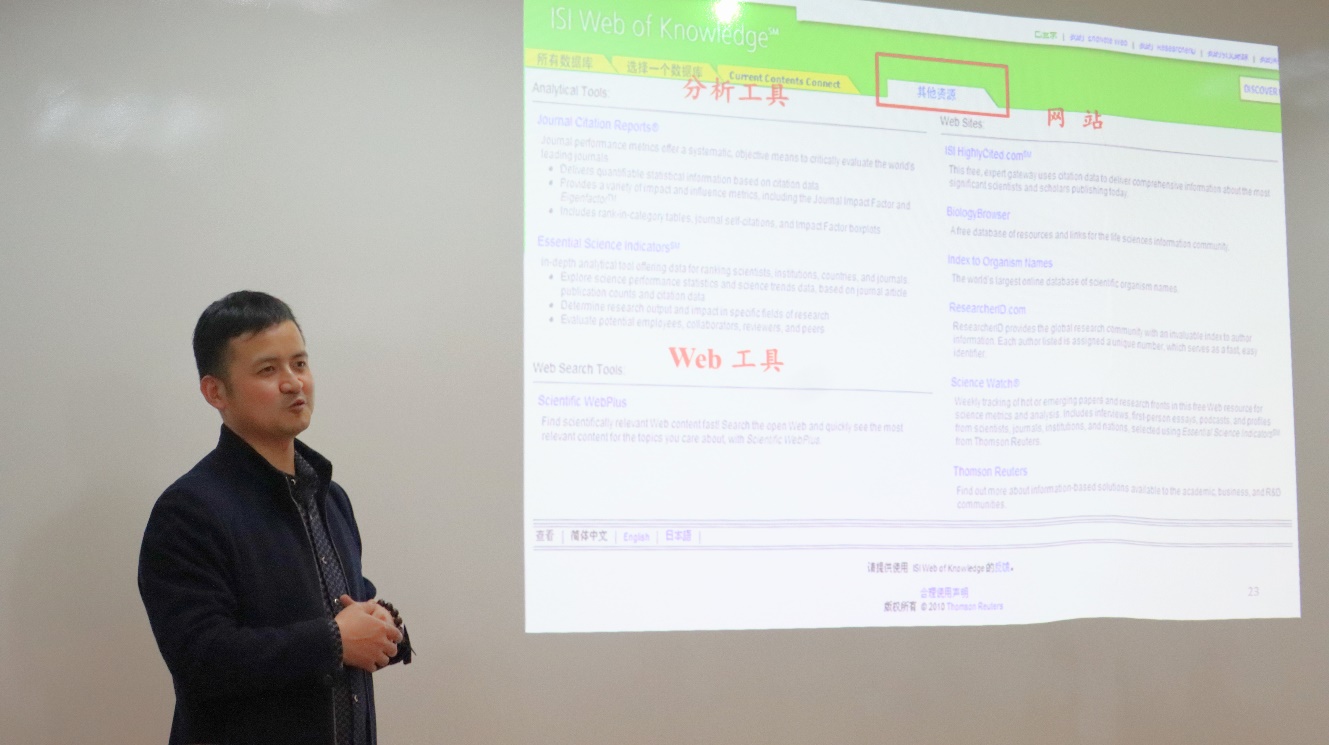 其次,就科技文献检索方面,李刚老师简要介绍了文献的分类及五种获取全文或原文的方法。接着,李刚老师详细介绍了文献检索网站。例如:检索中文文献的中国知网,万方数字化期刊,检索英文文献的Google scholar,Web of Knowledge和PubMed等网站。并且,他也详细介绍了每个网站的特点来使同学们更加准确的查找到所需文献。随后,李刚老师简要讲述了常用专利、标准的相关网站,并重点推荐了“药物在线”,让我们可以免费从中下载各国专利。而就检索技巧方面,李刚老师主要介绍了数据库、引擎、论坛这3种方法。他指出,我们要巧用数据库,充分利用google/baidu和论坛网站。同时,他认为,我们要针对文献和期刊进行选择归类,大体可以分为核心文献、相关文献、边缘文献等。此外,阅读文献也要有“金字塔”原则。