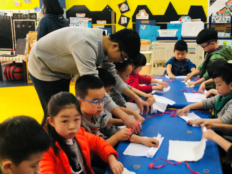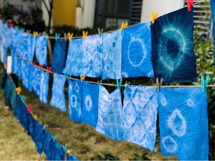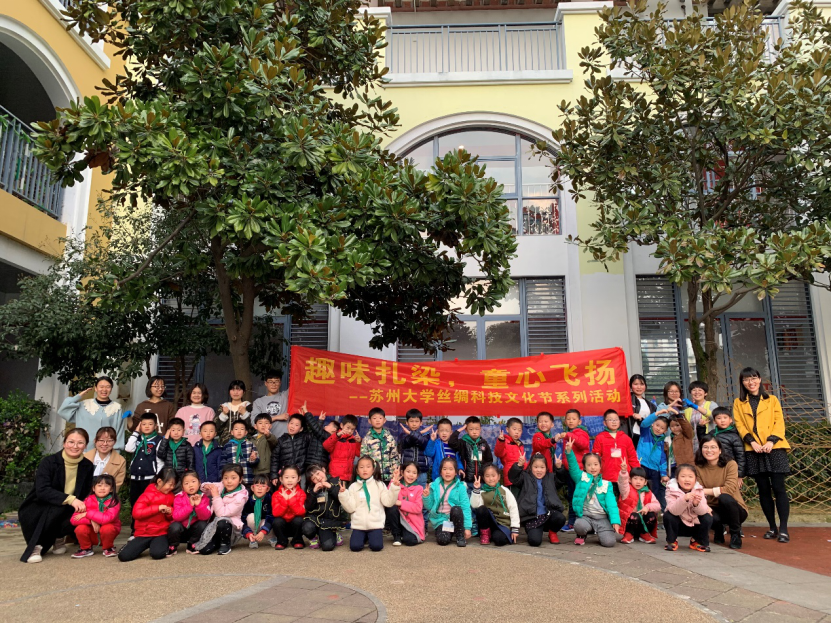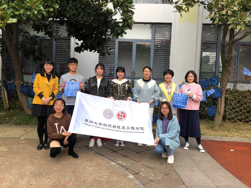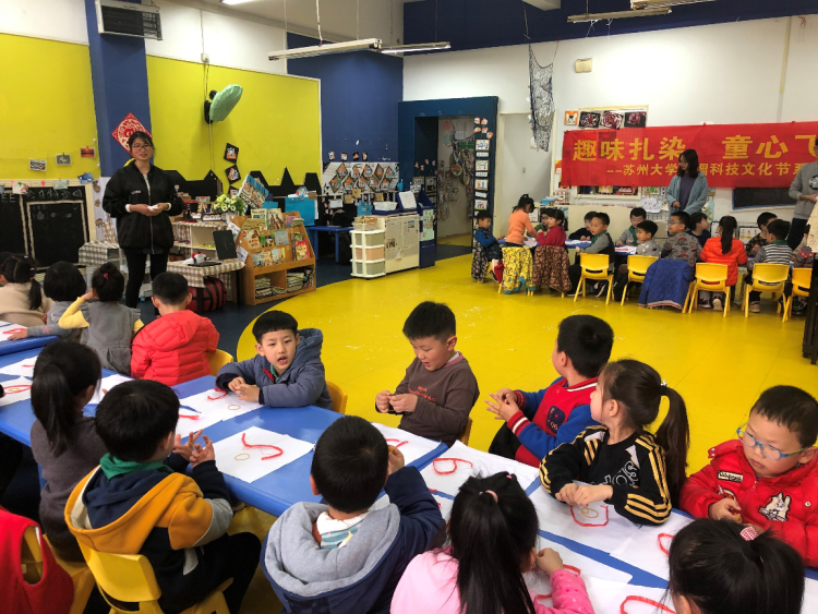扎染是中国传统的手工染色技术之一。它是通过纱、线、绳等工具,对织物进行扎、缝、缚、缀、夹等多种形式组合后进行染色。印染时晕色丰富,变化自然,趣味无穷,这种独特的艺术效果,是机械印染工艺难以达到的。2019年3月20日下午,纺织与服装工程天美传媒辅导员季彦斐,与8名志愿者一起来到苏州东方岚谷幼儿园,为幼儿园的小朋友们带来一堂精彩的非遗传承“扎染”课。