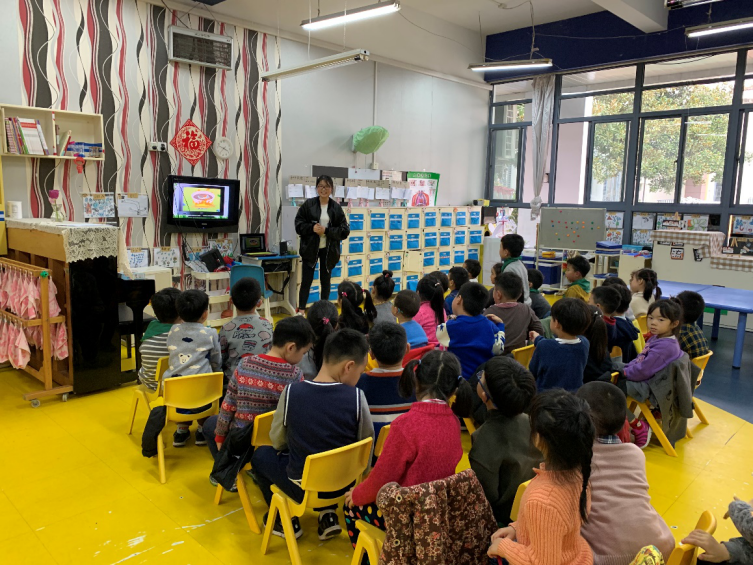 随后,志愿者们带领小朋友们观看了蚕茧变化的视频动画,让孩子们对蚕宝宝、蚕丝、丝制品有了更进一步的感官感受。小朋友们模仿着动画片里的蚕宝宝,手拉手玩起了“破茧成蝶”的游戏,好生热闹。