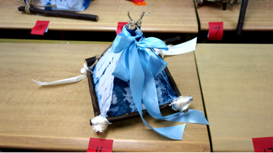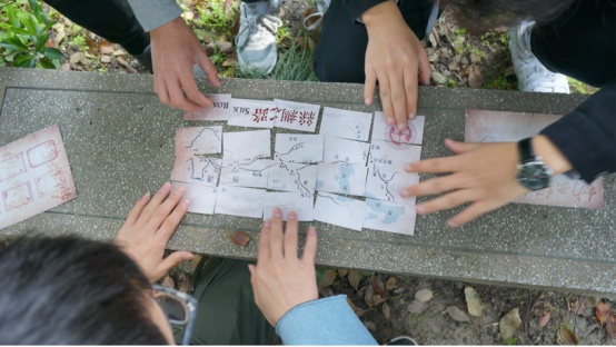 扎染环节结束后,第二环节开始。工作人员给每支队伍发放第一关卡线索卡,并记录下每支队伍的开始时间。该环节的六个关卡分别处于北区的六个不同地点,且工作人员在每个关卡处设有与纺织相关的小游戏。当参赛者成功完成游戏任务,即可获得下一关线索,以及最终环节的“时空灯笼”制作兑换卡。完成所有关卡的队伍,即可制作“时空灯笼”。