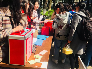 临近中午12点半,摊位上的人逐渐多了起来。答题的答题,些建议的写建议,一时间,小干事们被围得水泄不通,忙的不亦乐乎。答案声此起彼伏,中间夹杂着惊呼和微叹。不同颜色的便利贴被一张张撕下,塞入意见箱中,不同的礼品以惊人的速度被兑走。整个活动过程中,无论参与者还是组织者,都积极互动着,在思想的交流碰撞中感受到活动的乐趣。
