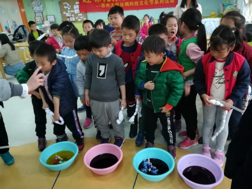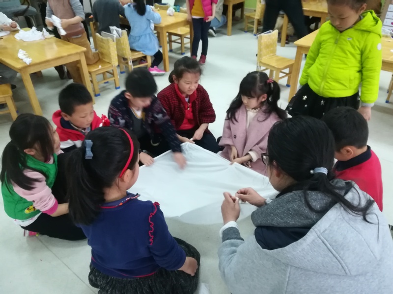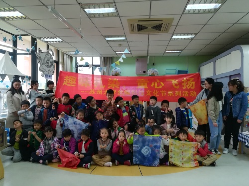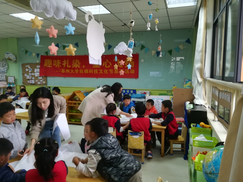 5名志愿者一起来到苏州翰林幼儿园,为幼儿园的小朋友们带来一堂精彩的手工课——扎染。