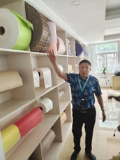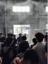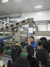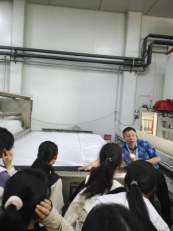 随后,程总便带领同学们参观了生产车间。从车间的温湿度、纤维原料的品种与规格,到梳理、牵伸、铺网、水刺、后整理和烘燥等工艺流程和设备,从水循环处理的必要性,到气水分离、气浮池、砂虑罐、金属过滤、袋式过滤等水处理流程和设备,再到最后的水刺非织造材料展示,程总耐心周到地讲解了各个步骤的实现方法以及需要注意的细节,进一步加深了同学们对水刺非织工艺和环境保护的理解。