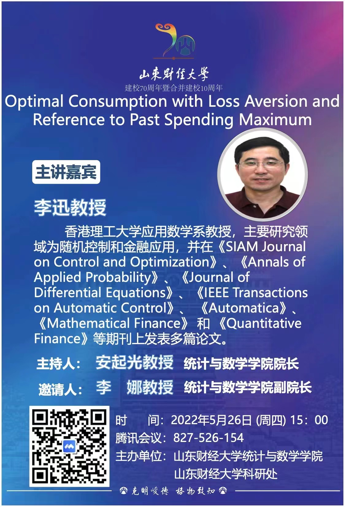 讲座题目:Optimal Consumption with Loss Aversion and Reference to Past Spending Maximum