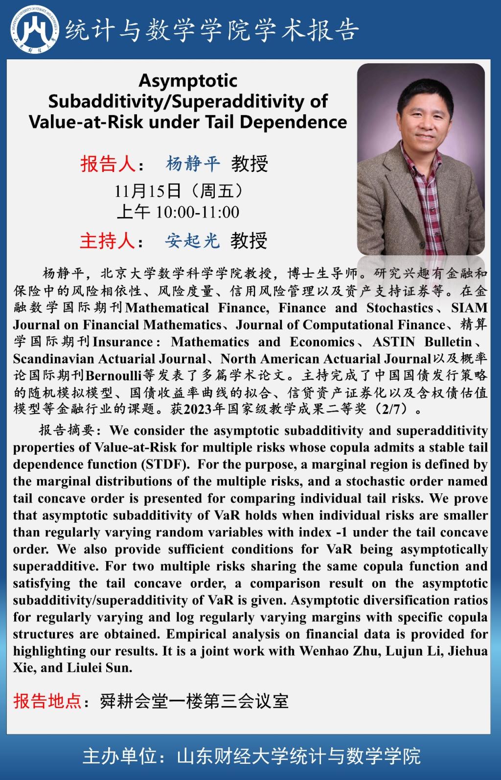 天美传媒 学术预告—Asymptotic Subadditivity/Superadditivity of Value-at-Risk under Tail Dependence