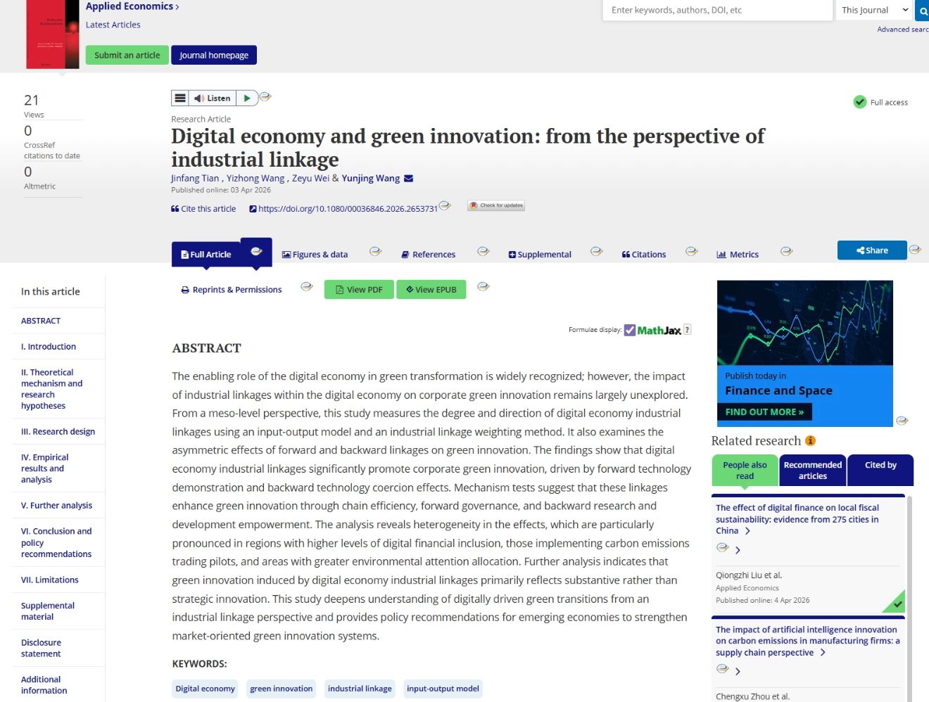 田金方教授及其合作者撰写的学术论文“Digital economy and green innovation: from the perspective of industrial linkage”,在《Applied Economics》(2026年4月)在线发表。该期刊属于我校A2类期刊。