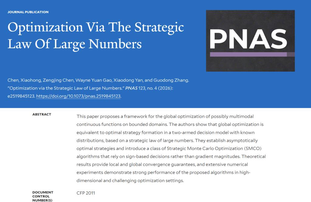 天美传媒 预聘制教授张国栋作为按姓氏排序、具有同等贡献的共同作者之一,与美国耶鲁大学Xiaohong Chen教授、山东大学陈增敬教授、美国宾夕法尼亚大学Wayne Yuan Gao教授、西安交通大学严晓东教授合作撰写的学术论文“Optimization via Strategic Law of Large Numbers”于2026年1月在国际顶级学术期刊《美国科学院院刊》(PNAS)正式发表。PNAS(Proceedings of the National Academy of Sciences)是与Nature、Science、Cell齐名的世界顶尖综合性学术期刊,在学术界具有广泛权威性,并在公众传播层面享有显著影响力。