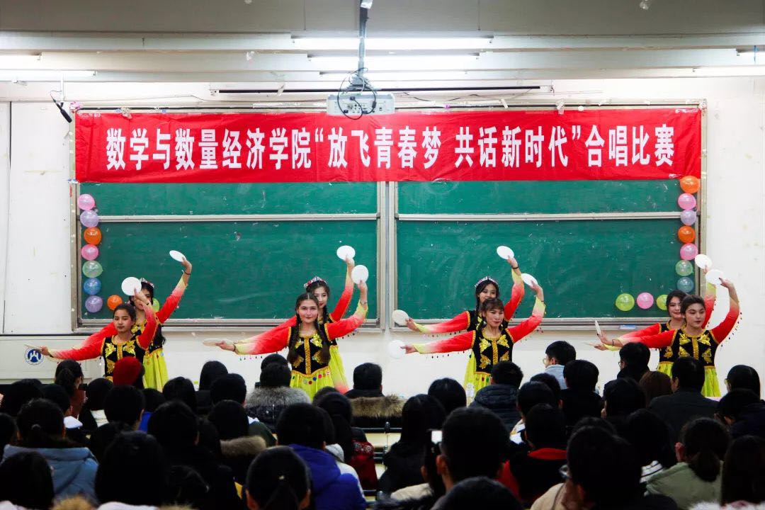 比赛伊始,金融数学一班带来歌曲《和你一样》,伴着手语表演和吉他伴奏,用歌声表达了同学之间相互陪伴,一起成长,努力追寻青春梦想的深情与默契。其次,金融数学二班带来歌曲《仰望星空》,呼吁每个人在暗夜来临、追梦受挫之时,坚持自己,让内心时刻充满力量与希望。随后,金融数学三班带来《夜空中最亮的星》,高昂的歌声唱出青春的梦想和热爱的力量,带着年轻的底气和不服输的闯劲。之后,金融数学四班带来《骄傲的少年》,年轻的心里是坚定的信念,每一位年轻人身上都背负着“不忘初心,牢记使命”的责任与担当。数学与应用数学一班带来经典的《倔强》,唱出了同学们的心声。越普通越是坚强,越普通越是倔强,越普通越是坚持,不怕千万人阻挡,只怕自己投降。数学与应用数学二班带来《让我留在你身边》,“时间向前走,一定只有路口没有尽头”,我们都一样,渴望梦想的光芒,分享你我的力量,就能把对方的路照亮。最后,预科班同学带来欢快的《和谐新疆》,表现了新疆人民的美好生活,唱出各民族大团结大发展的主旋律,节目中细致优美的新疆舞和活泼新潮的说唱,给嘉宾、评委留下了深刻印象。