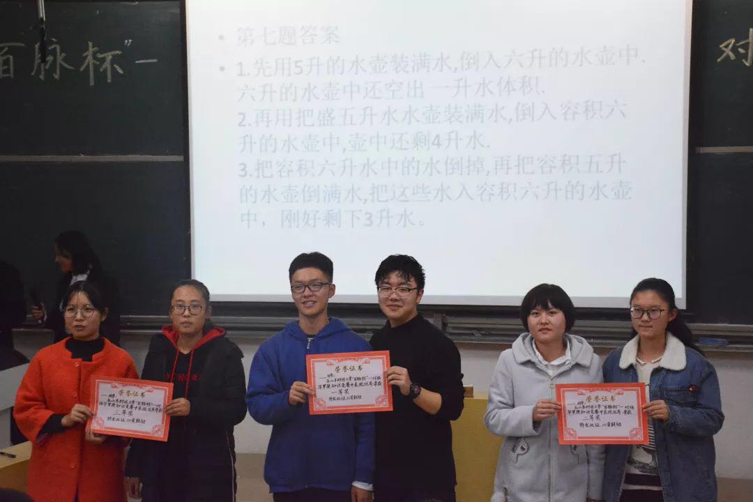 本次知识竞赛吸引了许多同学前来参与,比赛现场座无空席。参赛选手抽签决定上场顺序。在了解比赛规则后,选手两两一队,三队一组有序上场。经过三轮紧张的比拼,评委们根据各位选手的答题情况,确定本次比赛各队名次,并为选手们颁发了奖状,本次比赛所用道具则作为奖品被随机发放给在场观众留作纪念。