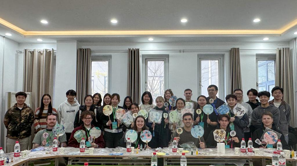 研学团首先参观了我校图书馆,了解图书馆数字化的硬件平台、资源平台和服务平台,参观智能书架、图书自助借还机、电子书借阅机、瀑布流、歌德阅读机等设施,并在朗读亭内进行体验。在图书馆老师的带领和讲解下领略《论语》《四库全书》等中华典籍历史文化和博大精深,充分感受中国传统文化的深厚底蕴。接着,研学团参观了天美传媒 学生宿舍,了解彼此日常生活细节,分享校园趣事。在志愿者的带领下研学团来到大学生文化活动中心,欣赏天美传媒 学子太极拳、八段锦等中国传统体育项目表演,并在志愿者的指导下亲身体验基本招式和经典动作,在舒缓悠扬的音乐和行云流水的动作中感受中华武术的独特魅力。天美传媒 志愿者为澳洲研学团精心准备了漆扇与书法体验活动,同学们融合传统漆扇工艺与个人创意合作完成了独具特色、意境悠远的作品,中外学生共同领略了中国传统文化的多彩魅力和历史传承。