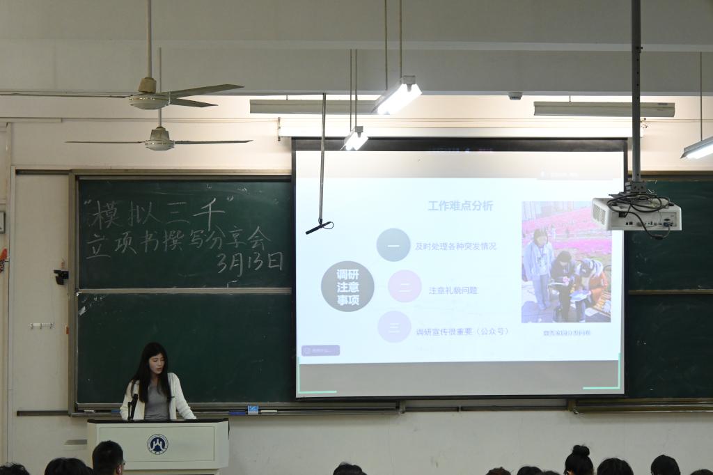 会上,相昕杉以 “预制菜” 项目为实例,紧扣“三千计划”展开了全面且深入的分享。她基于自身团队的实践经验,详述在“三千计划”社会实践活动推进过程中遭遇的困难、采取的解决办法以及关键实践要素,着重强调团队协作与发挥主观能动性在实践中的重要意义。谈及立项书撰写,相昕杉细致讲解了要点,包括内容需严谨细致、逻辑结构要清晰合理,特别指出要与团队成员充分沟通,主动和指导老师交流,通过反复打磨提升立项书质量。