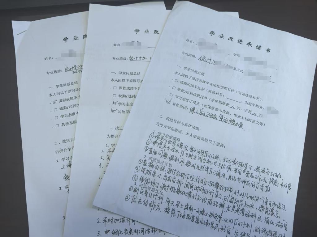 为持续关注及帮扶学业落后的学生,杨雅琳制定“破茧计划”专项帮扶措施:一是组建跨年级学业帮扶群,由专业教师、优秀学生提供“一帮一结对”辅导;二是加强家校联动机制,每月与相关学生家长进行微信沟通,反馈其学业情况;三是要求现场参会学生签署《学业改进承诺书》,明确其阶段性学习目标。下一步,学院将建立动态跟踪档案,定期公示相关学生进步情况。