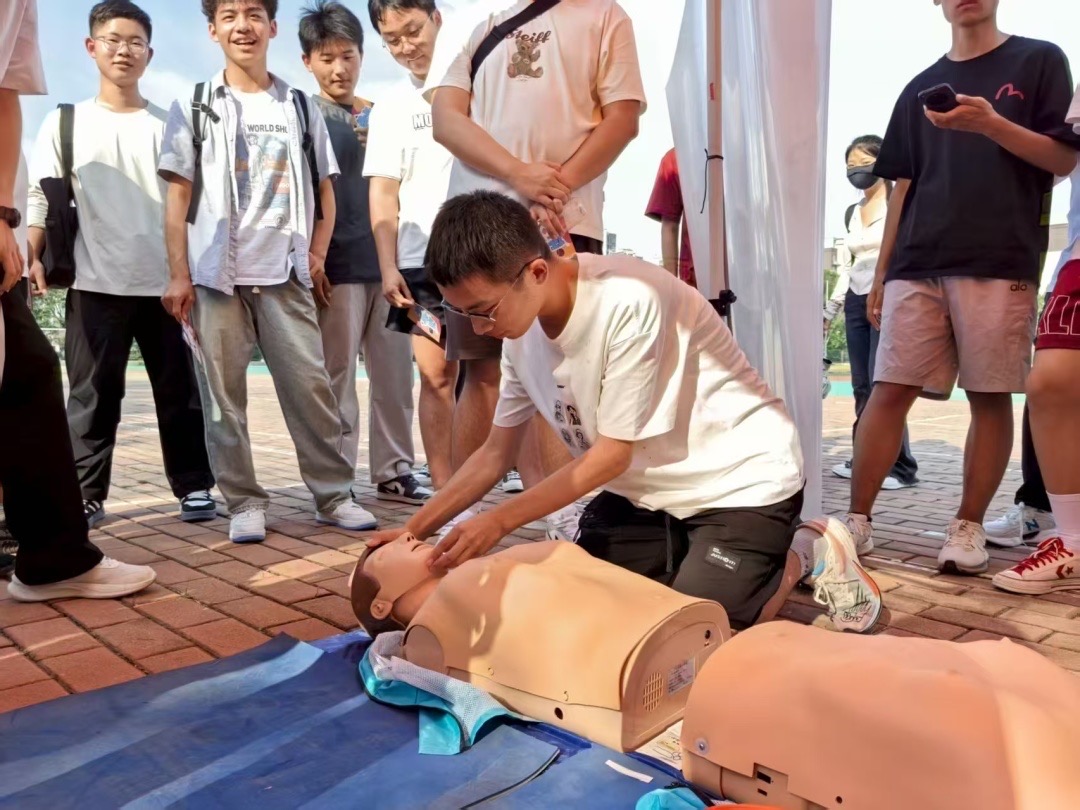 消防演练现场,专业人员详细讲解消防知识、急救知识和逃生技能。新生们认真学习灭火器使用方法、海姆立克急救法和心肺复苏,参与模拟火灾逃生演练,增强了消防安全意识与应急避险能力。
