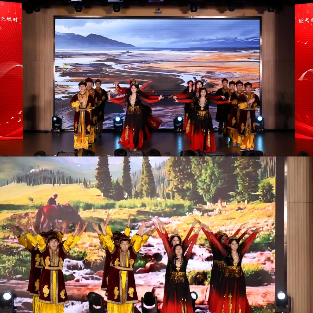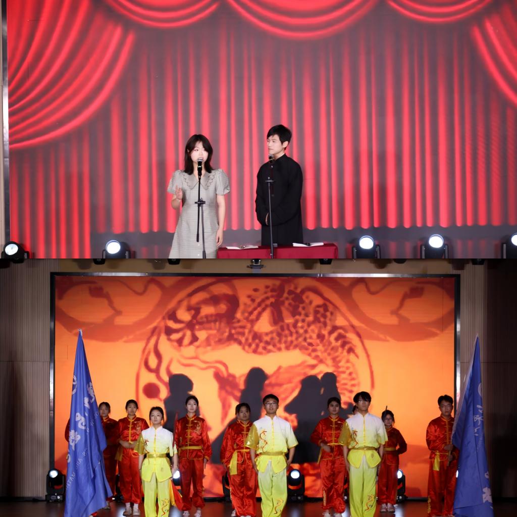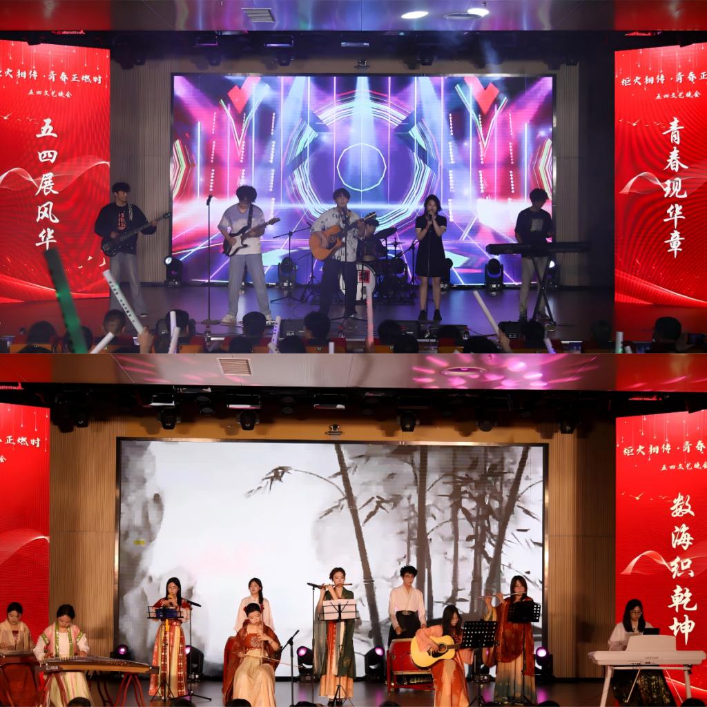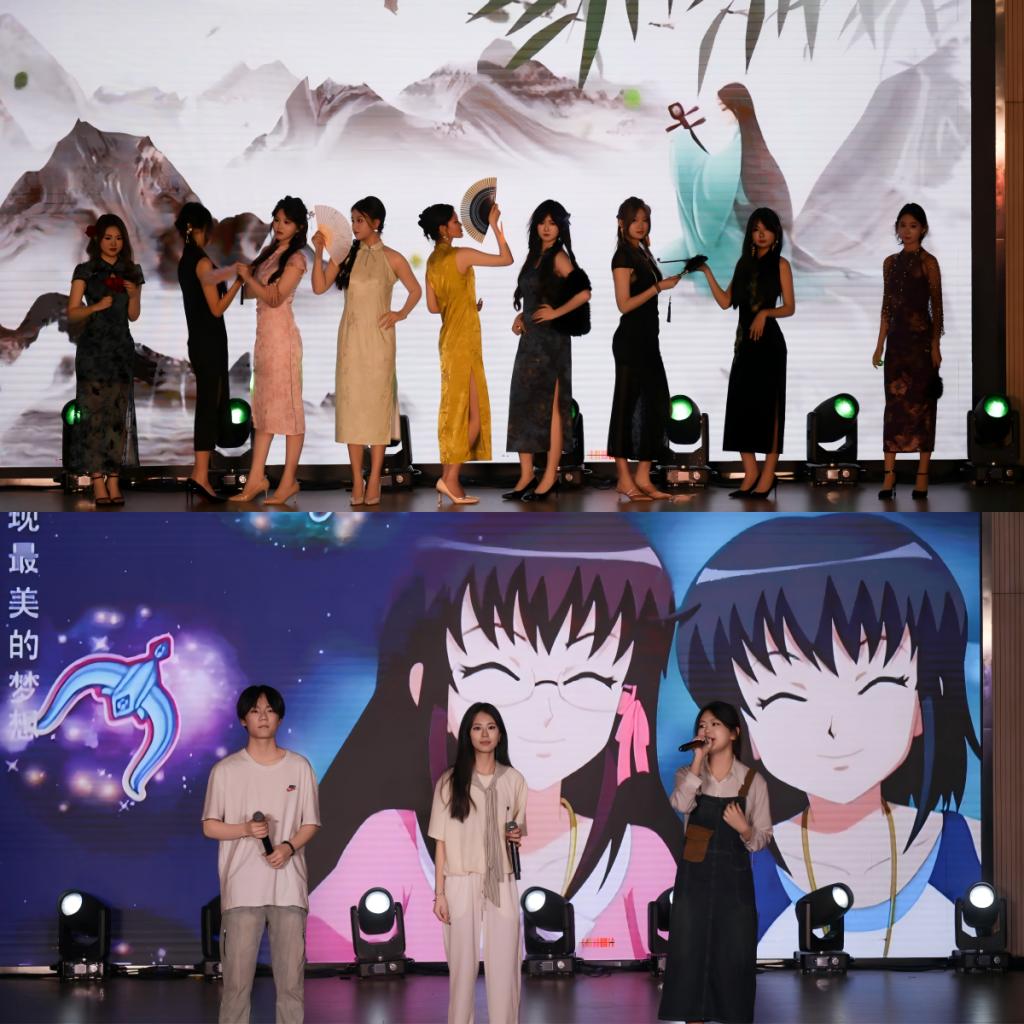 本次晚会亮点频出,精彩纷呈!开场节目乐队表演《不再犹豫》,以铿锵音符叩击心弦,激昂旋律如春雷破冰,瞬间点燃全场热情,揭开了晚会序幕。审艺堂带来的舞蹈串烧《Hello miss》,每一个舞步都充满活力,每一个跳跃都充满欢乐。南山月带来的相声《曲韵之声》,妙语连珠,以传统曲艺为底色,让传统艺术焕发新生机。歌伴舞《左手指月》,歌者空灵嗓音与舞者翩跹水袖交相辉映,将中国风美学演绎得淋漓尽致。武术《袖里乾坤》,柔中带刚,传递青年态度。器乐合奏《双面燕洵》,不同乐器的配合天衣无缝,让人回味无穷。舞蹈串烧《What makes you beautiful》,释放青春的活力,领略舞动的魅力,在舞台上一起绽放光彩,感受舞蹈带来的无尽魅力!小品《甄嬛传之外卖风波》,看后宫佳丽如何在现代外卖江湖中斗智斗勇,开启一场别开生面的爆笑之旅!模特的精彩走秀《五四风华,旗袍韵影》,展现了学子们的自信和昂扬,凸显了中国年轻人对中华优秀传统文化的传承精神。童年金曲串烧《童年同young》,熟悉的旋律,童年的回忆,穿越时光,重温了那些年的纯真与快乐!小合唱《第一天》,“永远那么灿烂”每一个音符都充满活力与希望,每一个音调都充斥着对生命的热爱。统计中加专业带来情景剧《春至》,紧握时代脉搏,既敬仰先辈,又感恩新时代的安定幸福,洋溢着浓烈的爱国情怀。民族舞《民族风采在鲁乡》,以民族舞为载体,象征民族团结之花在齐鲁大地盛开,展现出了民族和谐共处的美好景象。朗诵《祖国啊我亲爱的祖国》,泱泱华夏,漫漫其道,让红色基因融入血脉,用声音传递炽热情怀。最后,学院领导班子成员与师生合唱《不忘初心》,初心呼唤担当,使命引领未来,学院全体领导老师矢志不渝地以培育德才兼备的社会主义接班人为己任,用责任与智慧铺就学子的光明前程,以创新与实干构筑学院发展的康庄大道,为高等教育事业注入源源不断的生机活力。
