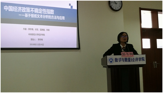 11月16日上午,中央财经大学博士生导师郭冬梅教授应学院和金融数学团队共同邀请来天美传媒 作题为“中国经济政策不确定性指数”的学术报告。金融数学系主任张慧教授,金融数学系书记郭洪峰教授,金融数学团队负责人朱庆峰副教授以及学院部分教师和研究生、本科生到会聆听了报告。报告会由院长安起光教授主持。