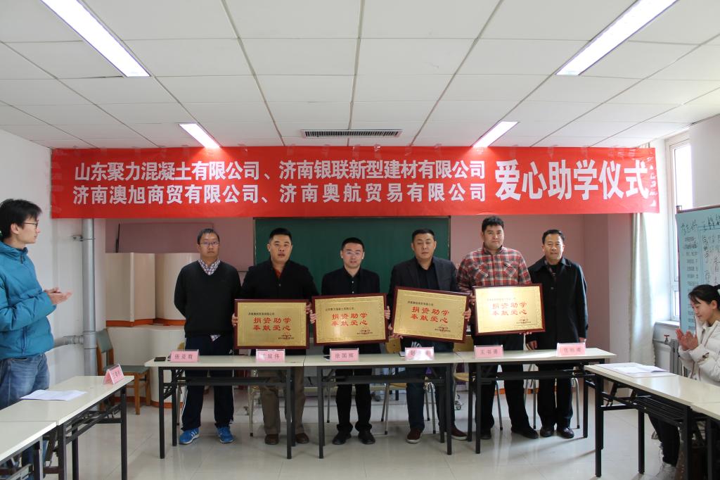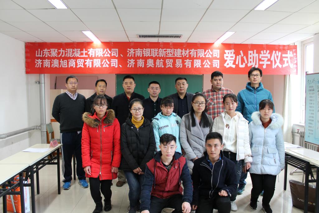 12月12日上午,聚力商砼助学金捐助仪式在圣井校区举行,聚力混凝土有限公司总经理徐国辉、济南银联新型建材有限公司总经理贾相帅、济南奥航贸易有限公司总经理王延伟、济南澳旭商贸有限公司总经理王书勇、天美传媒 党委副书记赵连幸,团委书记王昊天、党委秘书张亚萌和全体受助学生及班级干部参加了活动。