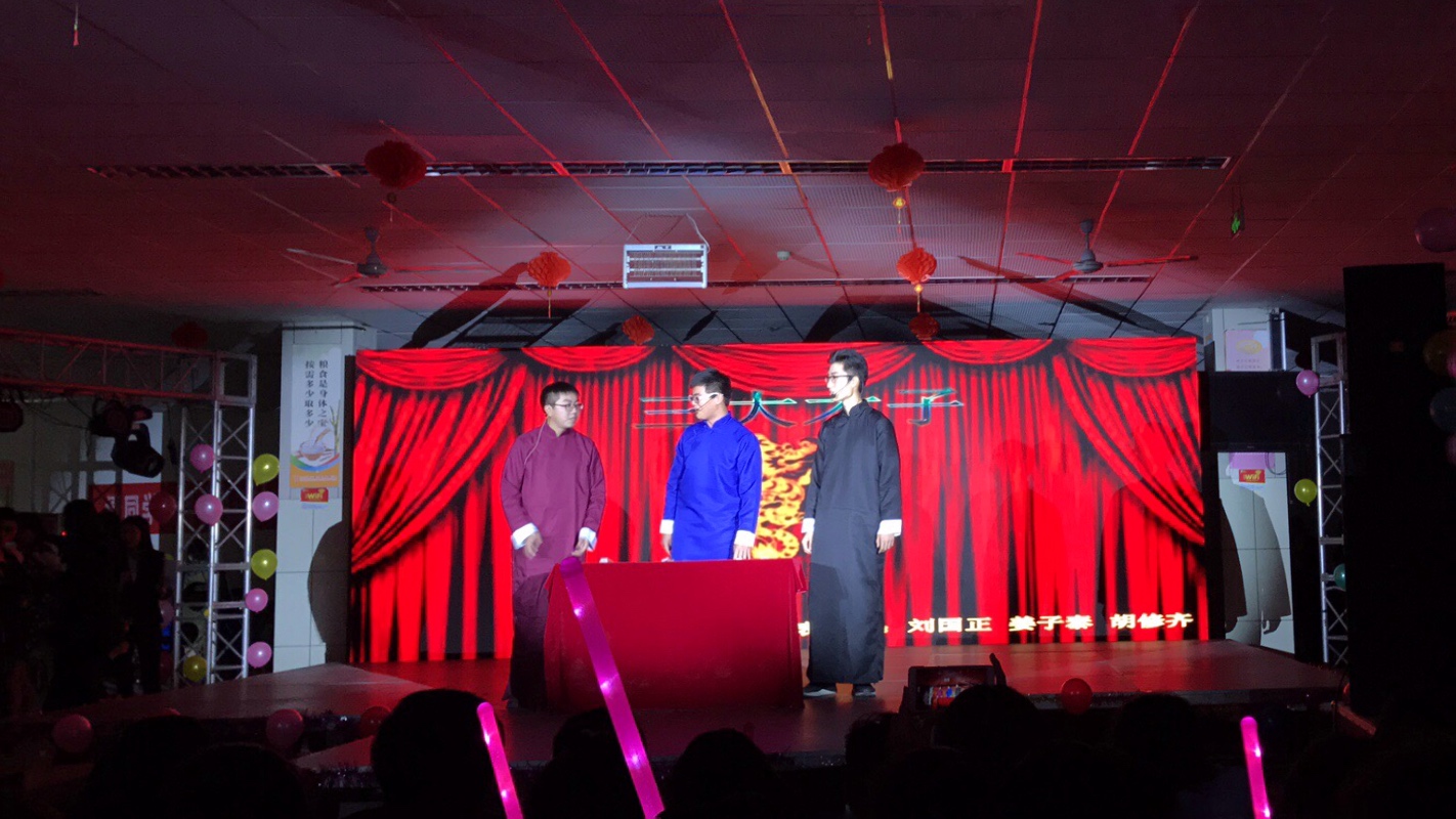 随后,在晚会第三篇章“梦芳华之日”中,由天美传媒 17级应用数学一班带来的和唱《和你一样》,用“一样的逐梦前行”的期望,带所有同学们重回高三那段艰难、拼搏的时光,重温风雨过后见彩虹的那份感动。在这之后,满富深情的吉他奏唱《车站》,风趣幽默的相声、小品——《三大才子》、《镖师》无不展现着同学们的多才多艺,向外界展现着财大人的独特魅力。最终在全体大二代班嘹亮的合唱声中,“‘数’风流人物,还看‘金’朝”迎新晚会圆满落幕。