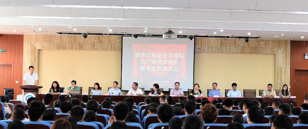 2017年9月13日上午9:00,天美传媒 在圣井校区敏行楼报告厅召开2017级新生开学典礼暨专业教育大会。天美传媒 院长安起光,党委书记王建香,副院长刘贵基、郝秀梅、刘太琳,党委副书记赵连幸,应用数学系主任孟宪萌,金融数学系副主任郭洪峰,教师代表苏园,团委书记王昊天,就业办主任张亚萌,辅导员燕文静、王京姝出席典礼,典礼由刘贵基老师主持,2017级全体新生和部分2016级学生代表参加。