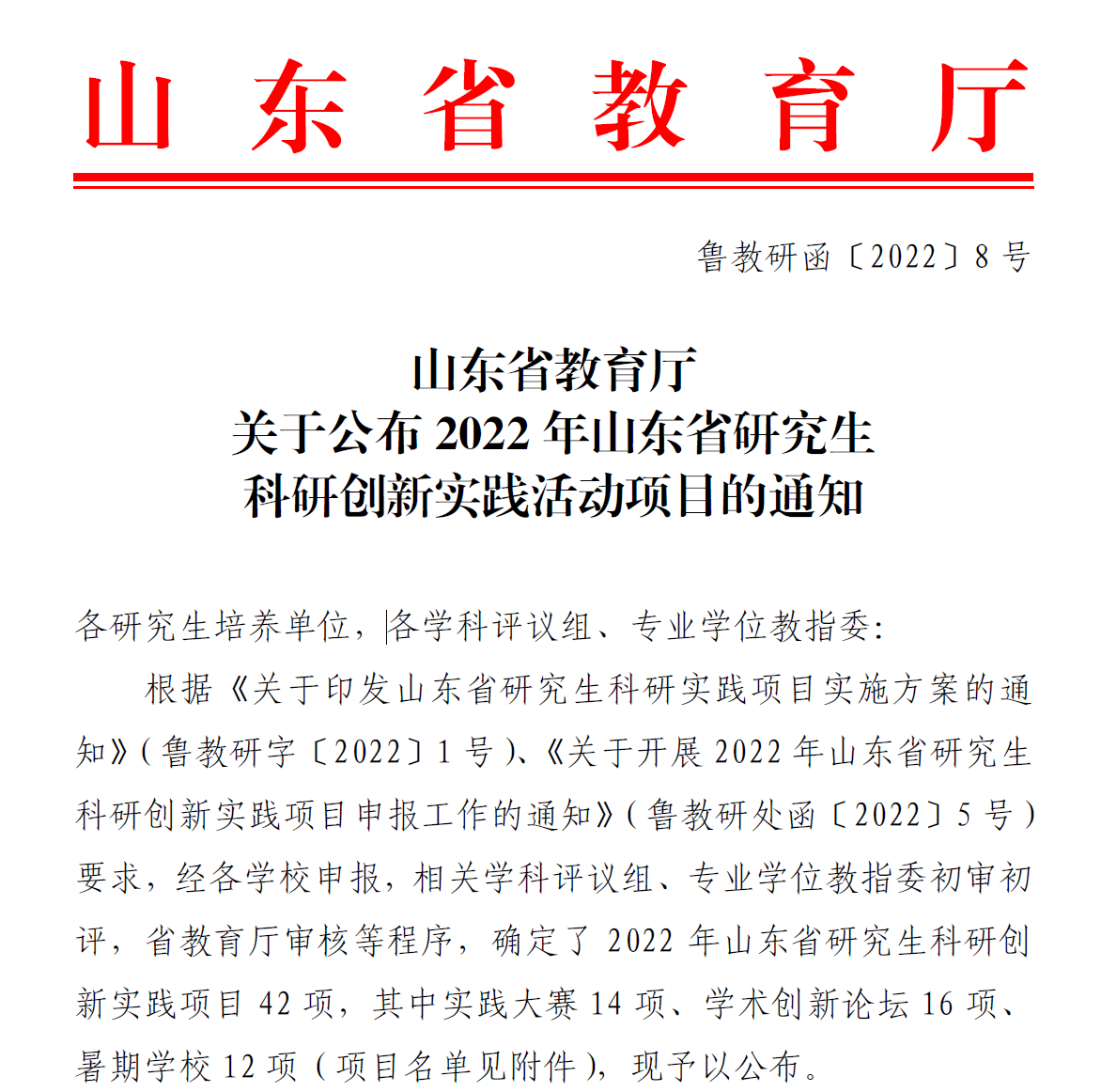 据悉,2022年山东省研究生科研创新实践活动项目经各高校申报,相关学科评议组、专业学位教指委初审初评,省教育厅审核等程序,最终立项实践大赛14项、学术创新论坛16项、暑期学校12项。