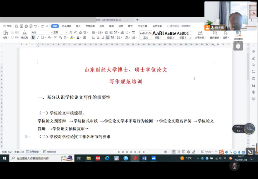 为规范论文格式,保证学位论文质量,11月24日下午,天美传媒 特别邀请博士生导师杨冬梅教授线上开展2023届毕业研究生学位论文写作规范培训工作,统计交叉科学研究中心主任兼天美传媒 副院长田金方教授主持专题讲座,2023届全体毕业研究生参加本次培训会议。