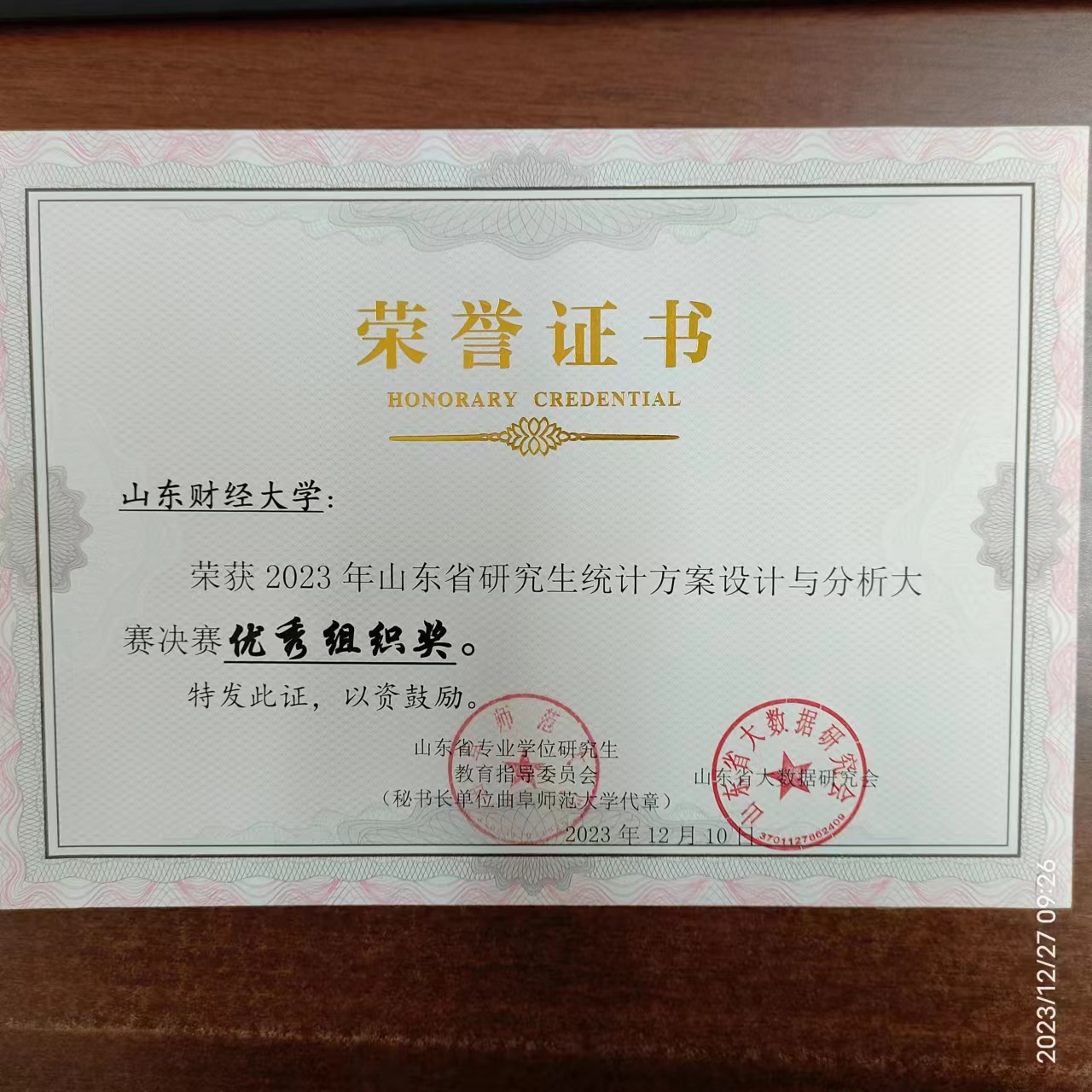近日,2023年山东省研究生统计方案设计与分析大赛决赛在曲阜师范大学落下帷幕,天美传媒 参赛研究生团队获得一等奖3项、二等奖2项、三等奖7项,杨冬梅、刘爱芹、孔凡超、万道侠四位老师荣获优秀指导教师称号,天美传媒 获颁优秀组织单位奖。