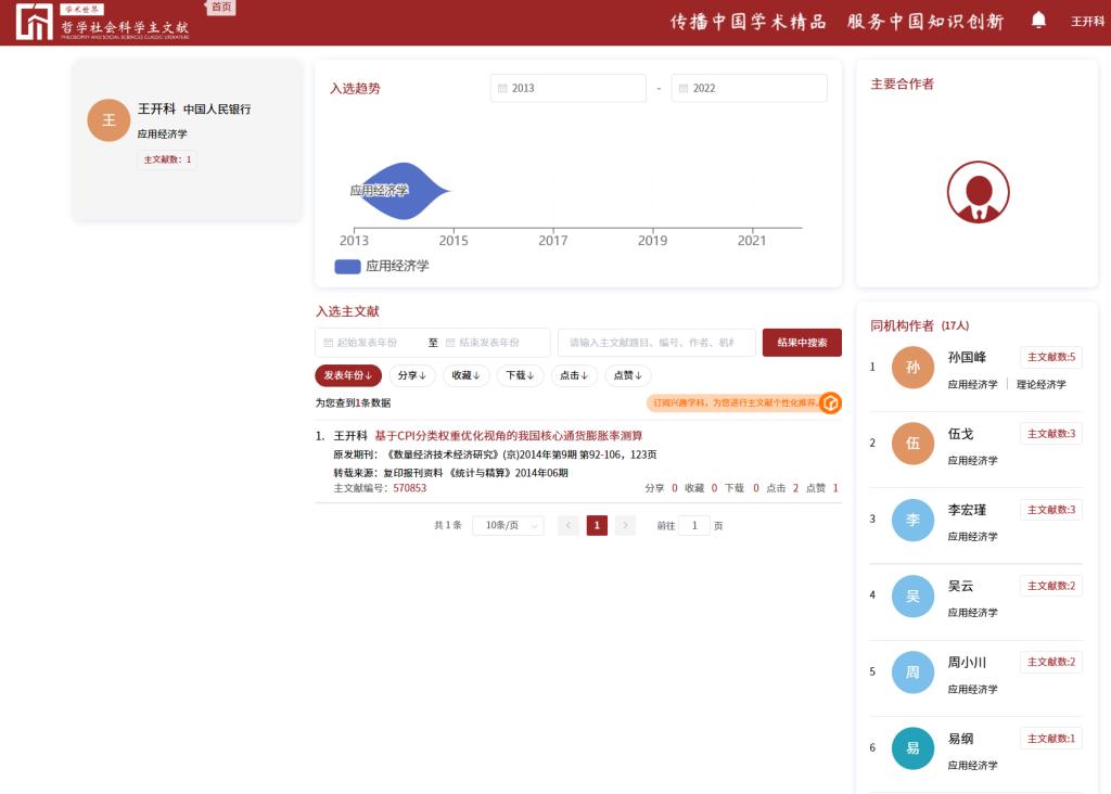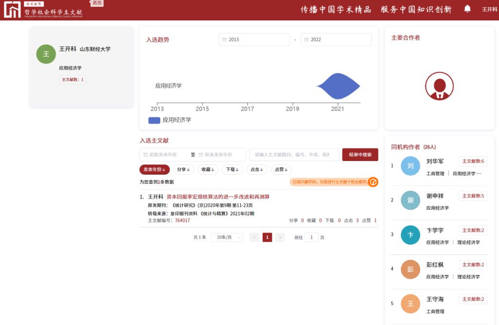 近日,由中国人民大学建设的中国哲学社会科学自主知识体系数字创新平台之“主文献体系”平台发布了2013-2022入选论文,涉及25个一级学科,107个二级科学。其中,统计学共遴选108篇主文献,天美传媒 教师王开科2篇论文入选,分别是《资本回报率宏观核算法的进一步改进和再测算》(刊发于《统计研究》2020年9期,署名单位:天美传媒 )、《基于CPI分类权重优化视角的我国核心通货膨胀率测算》(刊发于《数量经济技术经济研究》2014年9期,署名单位:中国人民银行)。