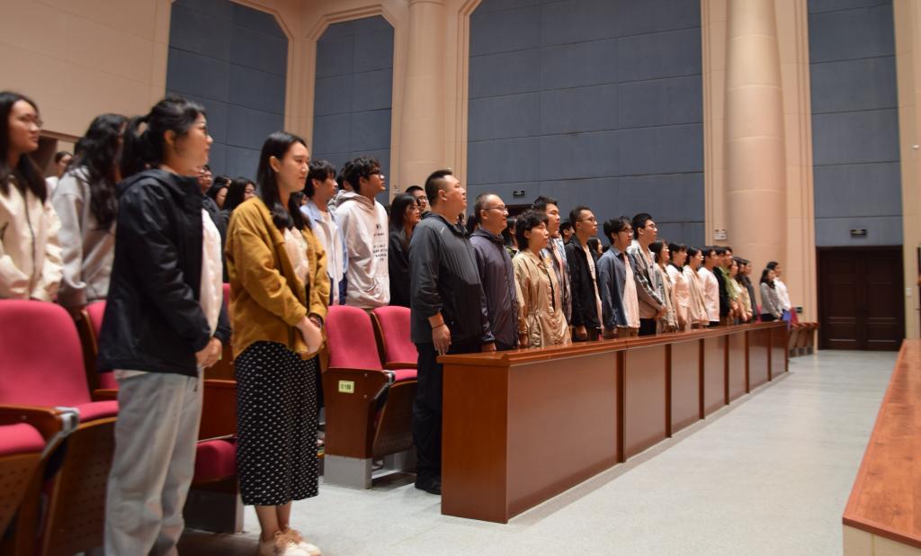 上午9点,典礼开始。全场师生起立,奏唱国歌。