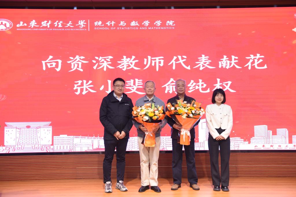 学院青年教师为资深教师代表张小斐、俞纯权献上鲜花。