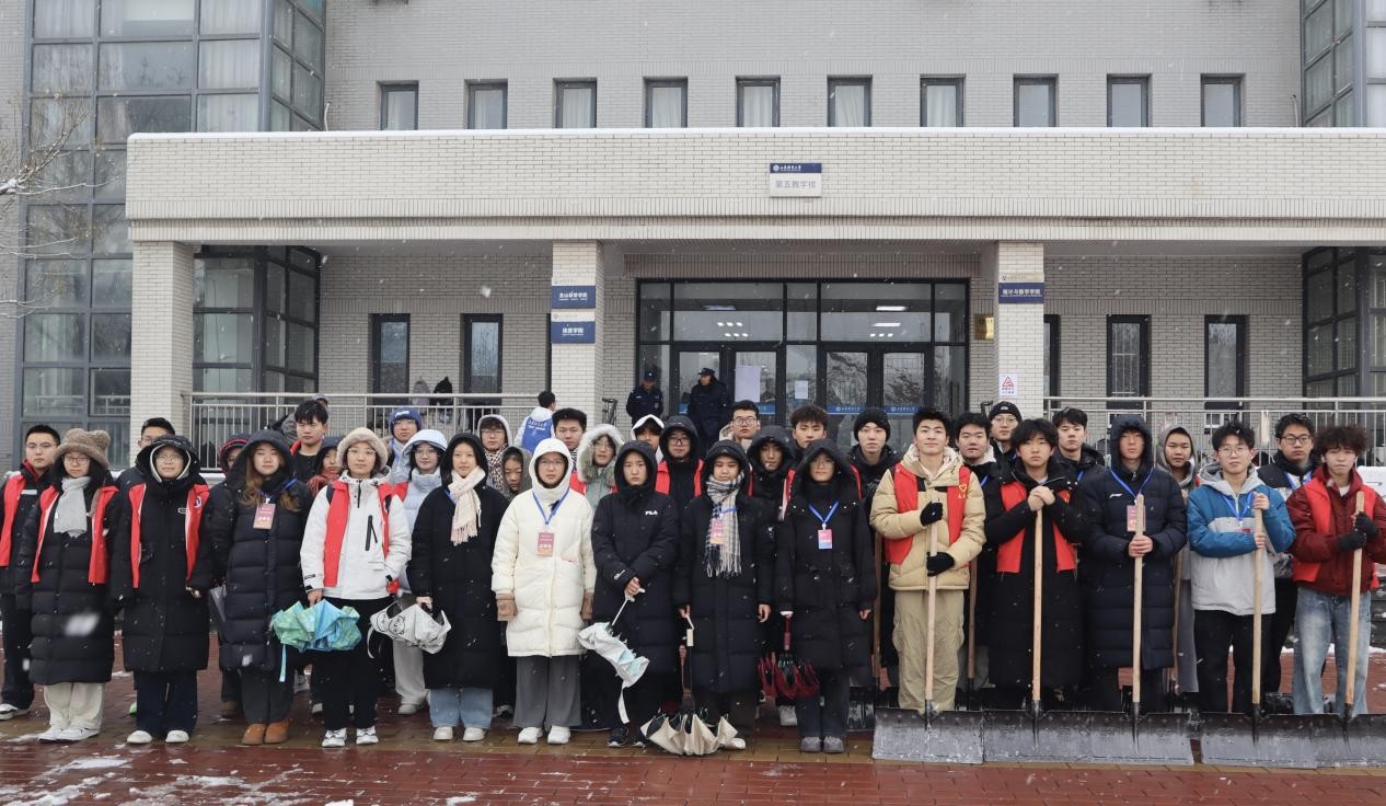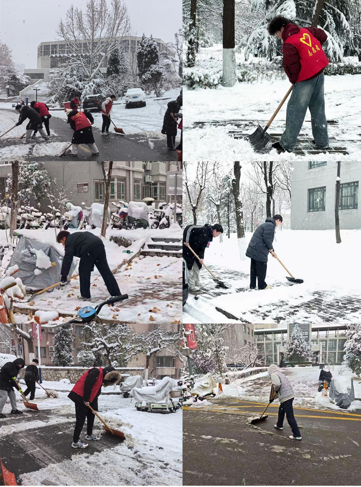 清晨,寒意袭人,积雪尚未消融。学院学生干部们以雪为令,主动集结,手持铁锹、扫帚等工具,分组分片投入到扫雪除冰的行动中。大家齐心协力、配合默契,尽管冷风扑面,但热情不减。挥锹的节奏沉稳有力,扫雪的声响沙沙连绵,志愿者们不畏严寒、默契配合,忙碌的身影在雪地中交织成一道有序而坚韧的风景。