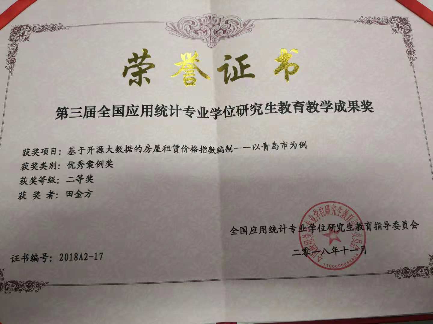 11月9日至11日,由国务院学位办全国应用统计专业学位研究生教育指导委员会(以下简称“教指委”)主办、中国统计教育学会高等教育分会主办,兰州财经大学统计学院承办的第三届全国应用统计专业学位研究生案例大赛颁奖典礼及学术交流会在兰州财经大学和平校区举行。2017级应用统计专业学位研究生李泽鑫、徐玉娇和张君宇合作完成的项目案例《基于开源大数据的房屋租赁价格指数编制——以青岛市为例》荣获大赛二等奖,同时作为应用统计专业学位研究生教学参考案例入选优秀案例库进行出版,指导教师田金方教授获得相应级别的研究生教育教学成果奖。