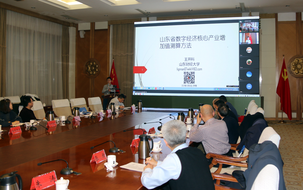 2021年12月8日,为深入贯彻落实省委、省政府重大决策部署,加快推进数字强省、制造强省建设,在山东省工业和信息化厅、山东省数字经济专家咨询委员会指导下,天美传媒 管理科学与工程学院、数字经济研究院联合中国大数据产业生态联盟等单位共同举办“山东数字经济与数据产业发展研讨会暨山东省数字经济专家咨询委员会年会”,来自省工信厅、省发改委、省科技厅、省商务厅、省国资委、省大数据中心、省数字经济协会、省移动公司、山东大学和天美传媒 等单位的40余位济南本地专家现场参会,100余位外地专家通过网络视频会议参会。院长李国锋教授应邀参加了本次研讨会,王开科副教授应邀在大会上做了题为“山东省数字经济核心产业增加值测算方法”的主题发言。