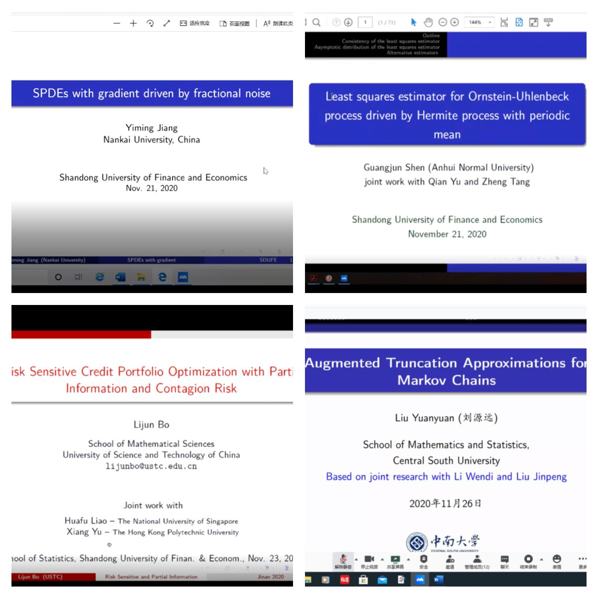 四位学者分别就分数噪声梯度驱动的SPDE、Hermit过程的参数估计、部分信息和传染风险下的风险敏感信贷组合优化以及马氏链平稳分布的截断近似等做了4场精彩报告。各位专家学者参与了系列活动,并与天美传媒 青年教师和研究生进行了交流。青年教师就学术研究和课题申报等问题与专家学者进行了咨询;研究生们就自己关心的兴趣选题、研究方法以及博士招考等问题,请教了向各位专家。