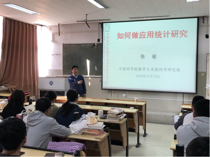 2020年11月15日上午,中国科学院数学与系统科学研究院陈敏教授应邀来天美传媒 进行学术交流并做了题为“如何做应用统计研究”的学术报告,会议在一号教学楼1505举行,学院2020级全体研究生参加了此次交流,报告会由李国锋院长主持。