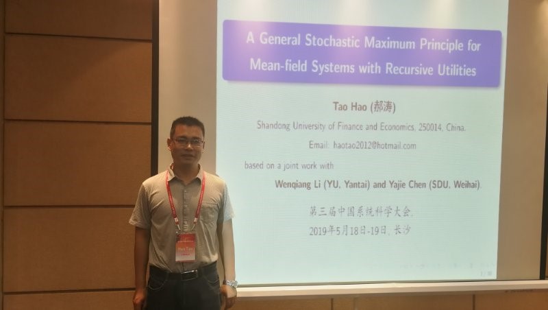 2019年5月18日至19日,天美传媒 郝涛老师应邀参加在长沙举办的第三届中国系统科学大会,并做题目为“A General Stochastic Maximum Principle for Mean-field Systems with Recursive Utilities ”的报告。大会由上海系统科学研究院主办,国防科技大学承办,中国科学院数学与系统科学研究院系统科学研究所、北京师范大学系统科学学院、北京交通大学交通系统科学与工程研究院、中国船舶工业系统工程研究院、中国系统工程学会、中国自动化学会控制理论专业委员会等单位协办。旨在为系统科学及其相关领域的国内外专家学者提供一个学术交流平台,促进相关学科的交流、发展和融合,促进新方向、新领域的产生。