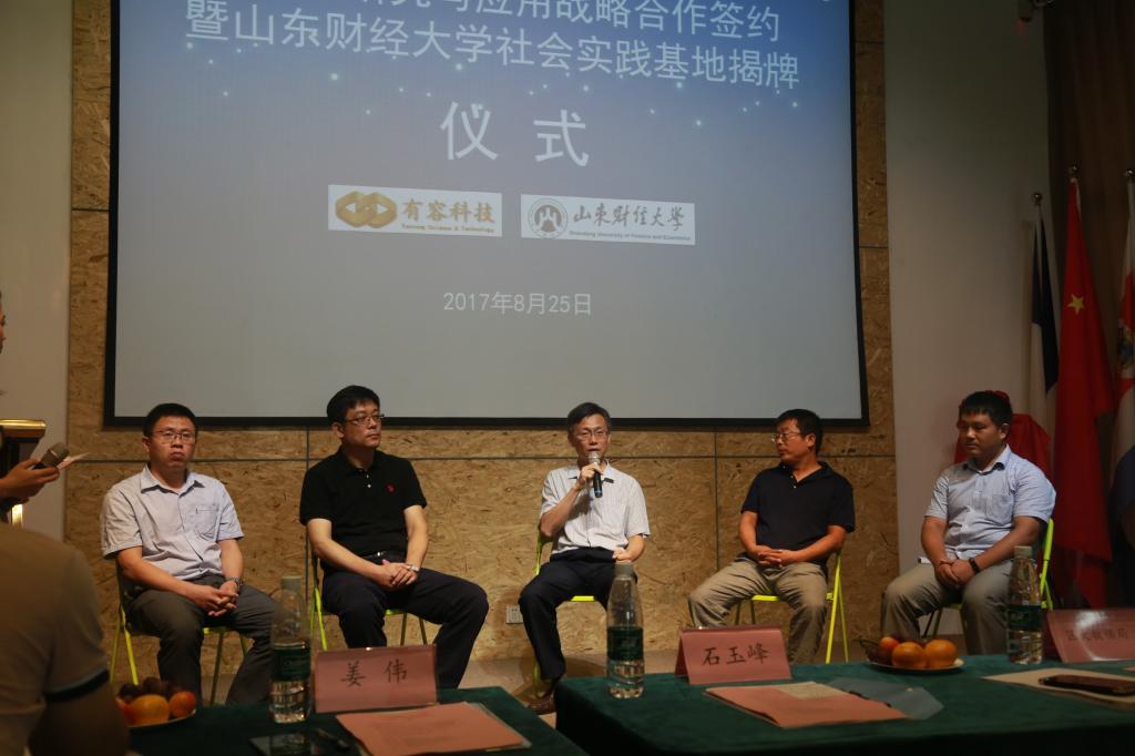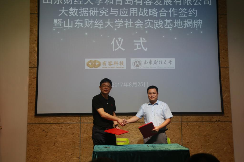 随后,统计学院党委书记姜伟与青岛有容发展有限公司总经理贺才贵先生共同签约大数据研究与应用战略合作协议书。石玉峰与徐乐家共同为“社会实践基地”揭牌。