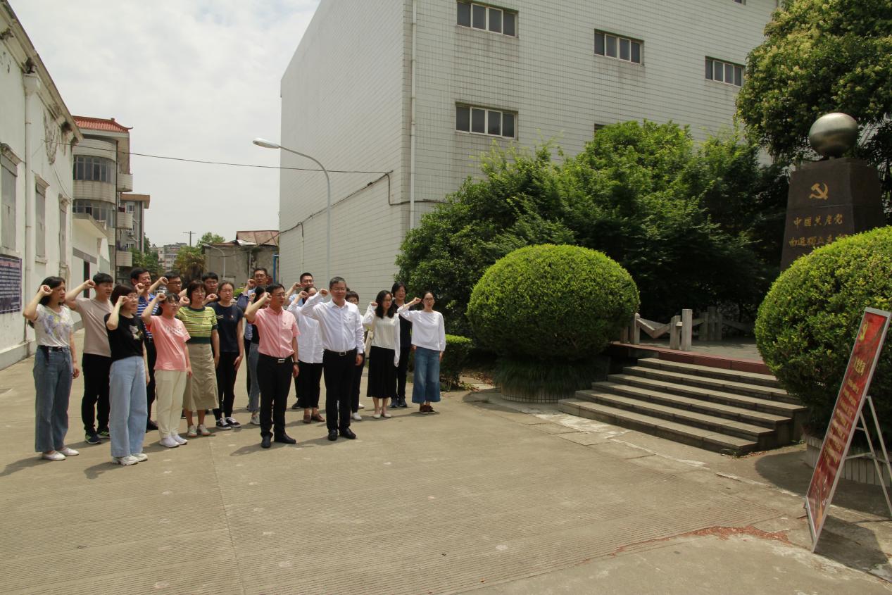 全体党员来到“中共南通独立支部纪念地”碑前,纪念碑庄严伫立于老厂区内的苍松翠柏间,张启祥讲解了纪念碑尺寸及造型所蕴藏的特殊含义。全体党员在此庄严宣誓,重温入党誓词。